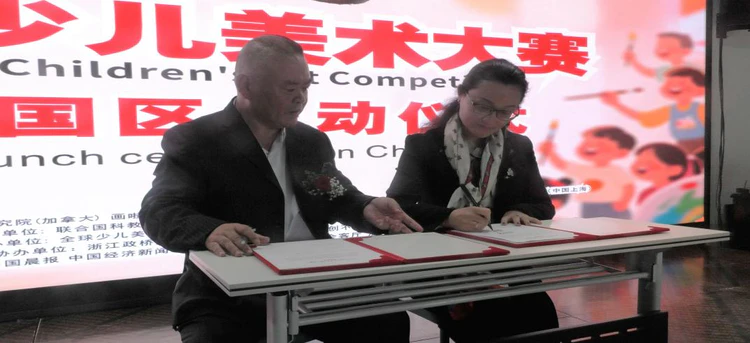 会上,同时举行大赛的签约仪式,邀请全球少儿美术大赛组委会主席郑伟分别与上海美育研学中心主任屈慧珍、浙江省国际经济交流协会文化旅游委员会执行秘书长朱婉婉、河南大观美术馆馆长杨永刚、江南书画院院长路伟南、浙江省社区研究会文化创新专委会秘书长陈源、上海创不凡实业有限公司董事长姚圣康等签约代表进行了签约。